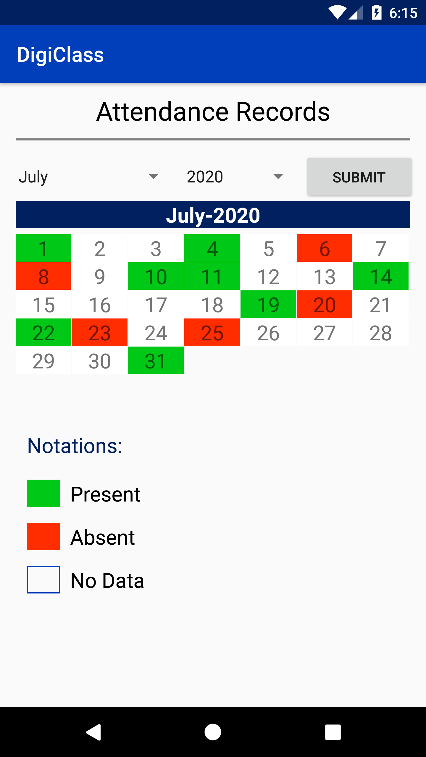 This screen shows the student's monthly attendance records according to specific month and year. However, by default, the current month and year is selected. You can select the month and year from the list about the attendance table and hit submit. Then, the relevant attendance records will be shown.