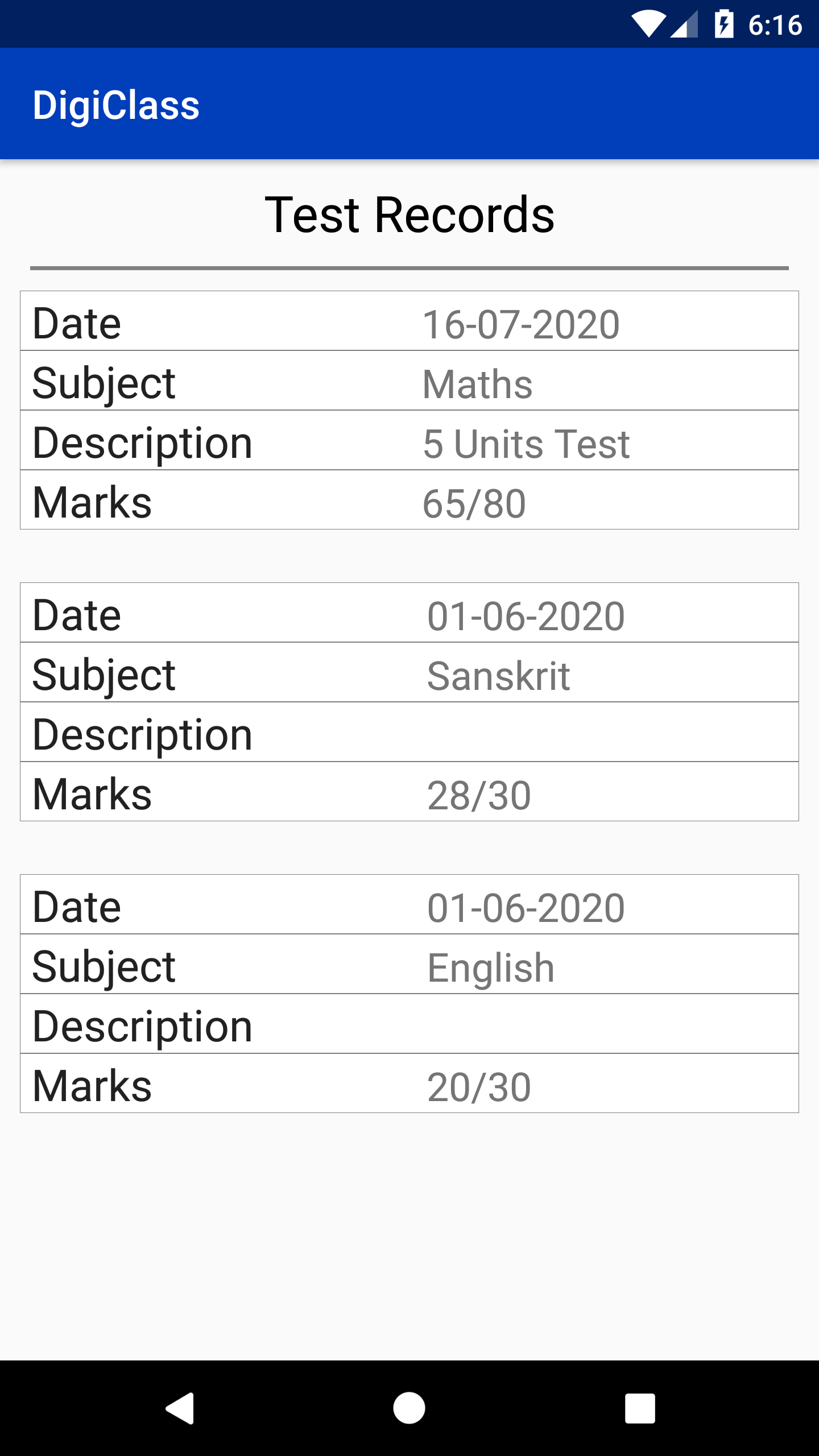 This screen will show you all the test records which are put by your Institute and attempted by you. It shows all the related data like date, subject, description and marks for every test record as follows.