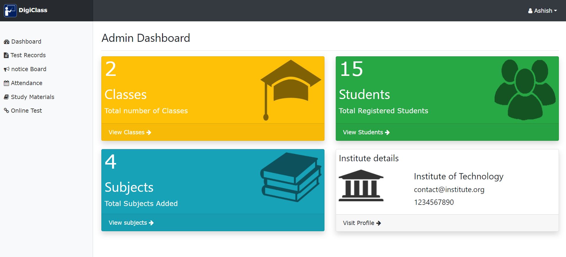 The bottom right card shows your institute details which are present in the system at the moment. The button Visit Profile at the bottom of the card redirects to the institute's details page where you can update its details.