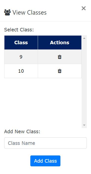 The above dialog lists the classes which are added. You can add a new class from this dialog by filling the name in textbox at bottom and click on Add Class button. The new class will be added. If you want to delete the existing class, then click on the (trash) icon and the class will be deleted.