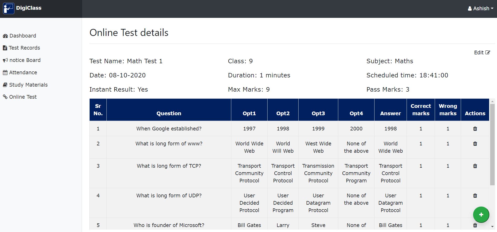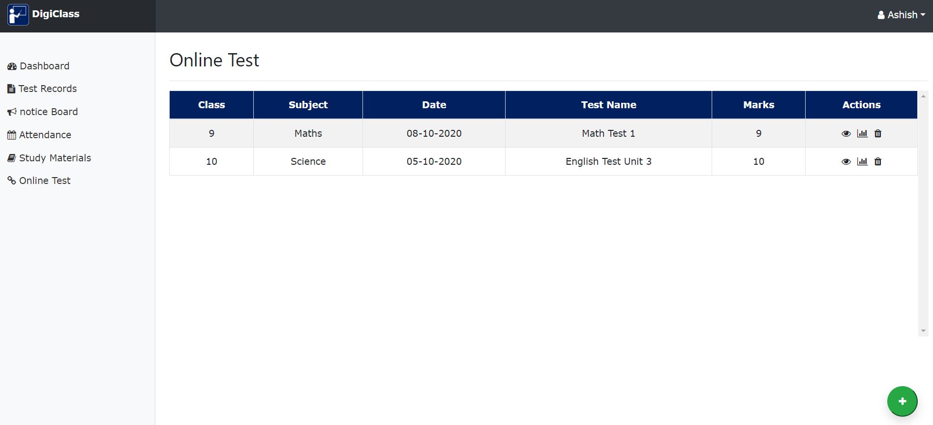 DigiClass provides the facility of conducting online test for students. Right from creating subjectwise test, putting questions to declaring instant results, everything you can do with DigiClass. To access it, select Online Test from the left navigation menu. This is the screen which you get.